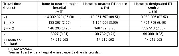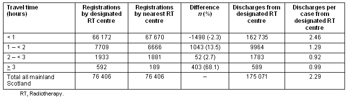 Growing centralization of cancer services either increases patient travel, or prevents or delays access to specialist services. Concentrating clinical expertise, rationalising access to specialist equipment and enhancing support services most likely does not benefit patients who fail to access treatment. Impact of travel on patients' experience is often underplayed. A literature review1 has highlighted that travel was perceived as a barrier to cancer treatment. Rural patients' travel costs are an important overall component of the costs of care2 but additional travel costs from centralisation are passed on to the patient3. In Scotland, services have been organised into 'managed clinical networks' (MCNs) with Health Boards aligning with a single tertiary oncology/radiotherapy (RT) referral centre, herein described as designated cancer centre (DRT). In consequence, population subgroups have been allocated to treatment centres that are not necessarily the closest to their home address. Finally, with fewer cancer centres and larger distances between them, the possibility of choice, a central tenet of the UK government's health policy is limited by travel considerations. Although the configuration of MCNs may be driven by efficiency savings, it has been argued that costs of health care can vary widely in different areas, with resource allocation not always reflecting clinical need4,5.