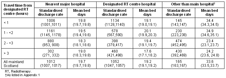 Hospital discharge data from mainland Scotland were selected using 2001 output areas converted to postcode using the postcode address file supplied to ISD by the Royal Mail. These discharge data were then allocated travel bands before generating population at risk to perform standard rate calculations. Finally, hospital discharge information was used for the bed day calculations by selecting a patient diagnosed with cancer within the time period, then extracting the information for the whole patient continuous inpatient stay (including any episodes of care within the same hospital stay pre- and post-cancer diagnosis). Thereafter, the bed day calculation was based on time from admission to the time of discharge over the whole continuous in-patient stay, irrespective of the time period considered.