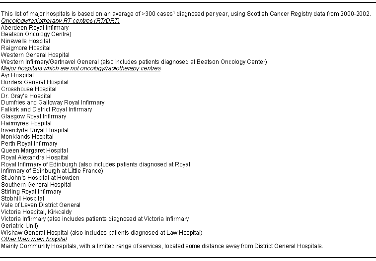 Published data for cancer care in Scotland are rather conflicting or confusing. Comparisons of rural and urban populations have shown higher standardised cancer incidence and mortality rates for most cancers in urban populations. Although that suggests a lower overall risk for rural populations in Scotland, increasing distance from a cancer centre was associated with poorer survival6. This increase was attributed to later diagnosis and a lesser likelihood of diagnosis before death7. Our study followed a survey showing the burden of travel on rural cancer patients8. Patients receiving less specialised care are less likely to receive chemotherapy or radiotherapy9-12. An English study has suggested that delays in diagnosis are related to distance from primary care centre, rather than from hospital care13. Thus, for rural patients, later diagnosis and increased mortality is also associated with a lower hospital admission rate to oncology units.