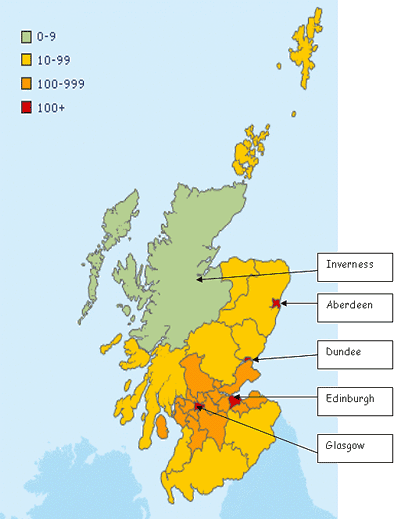 Figure 1: Map of Scotland showing population densities per square kilometre and location of oncology/radiotherapy treatment centres.