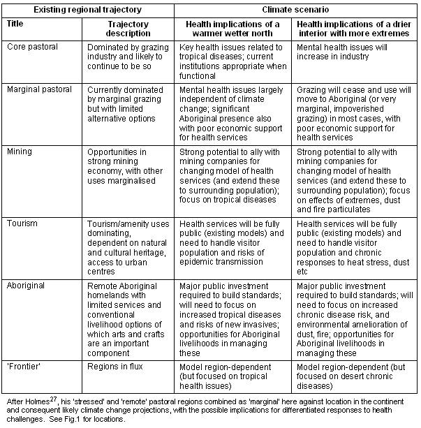 We have shown that addressing the health impacts of climate change in the Australian desert will involve working with how altered environmental, social and economic conditions interact with existing health conditions. We note that responding to the impacts of climate change on health in the Australian desert will involve the active participation of a variety of interest groups ranging from local to state and federal governments and a range of public and private agencies, including those not traditionally defined as within the health sector. The modes of engagement required for this process need to be innovative, and will differ among regions on different trajectories. To this end, we have attempted a first classification of these trajectories. This classification may require considerable refinement; however, we emphasise, it suffices to show that some form of sensible disaggregation is required to make progress in this vast and under-resourced heartland of Australia.