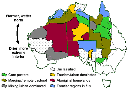 Figure 1: Locations of the different types of regions in remote Australia as defined by Holmes27. See his original work for the names, more detailed characterisations, and the likely major divergent effects of climate change.