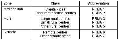 7. Australian Rural and Remote Workforce Agencies Group. ARRWAG Minimum Data Set Report - 30 November 2002. Appendix 2: Rural, Remote and Metropolitan Area Classification (RRMA) and Accessibility/Remoteness Index of Australia (ARIA). Canberra, ACT: ARRWAG, 2003.