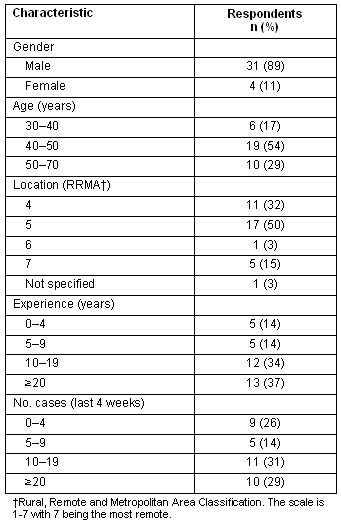 Thirty-five surveys were returned (response rate of 44%). Respondents from 21 hospitals returned their surveys. The demographics of the target population and survey responders were compared to determine if the survey results were representative. There was no statistical difference between the two groups in terms of age and gender. There was no statistical difference in terms of practice location, although the small percentage responding from RRMA 6 was notable. There was a difference between the groups in terms of practitioner type. The responder group consisted of 38% hospital based and 62% Queensland Health salaried. The target population consisted of 58% hospital based and 42% Queensland Health salaried. This was statistically significant (p = 0.0002).
