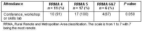 Table 2: Relationship between the practice location and attendance at a continuing professional development activity, such as conference, workshop or skills training laboratory