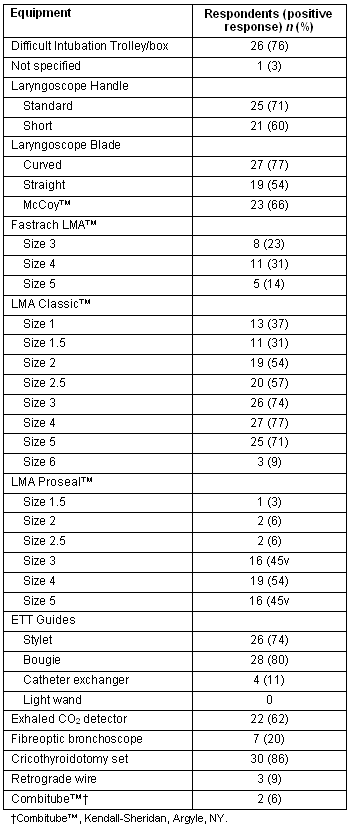Availability of the Fastrach Laryngeal Mask Airway (LMA; LMA North America Inc; San Diego, CA, USA) in all sizes was low. Seven out of the 35 (20%) reported the availability of a fibreoptic bronchoscope with one stating an inability to use it and another noting difficulty in obtaining and maintaining skills.