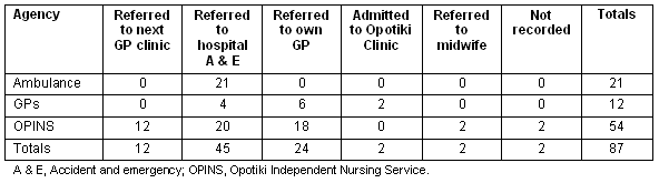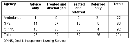 Table 2 shows the number of patients referred on by each service. Nurses referred 20 patients to the Accident and Emergency Department in Whakatane Hospital while the GPs only referred four patients during the month; 78% of patients were treated within the community without need for the hospital assessment. Excluding patients collected by ambulance, 87% of patients seen by the nurse or doctor were dealt with by local services alone. Most patients referred by OPINS and the GPs to Whakatane were transported by ambulance.