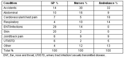 Table 3 is a comparison of the type of conditions seen by each of the services expressed as a percentage. Unsurprisingly more acute conditions are dealt with by ambulance services and nurses. Although not designated as such, the nurse assessment room acts as an accident and emergency service, dealing with all patients who present to the door at any time. The variation in conditions seen results from the difference in availability of the two services, in that patients seeking treatment for chest pain, fractures or lacerations are unlikely to wait until the next available GP clinic but will be treated and referred on to the Whakatane Hospital.