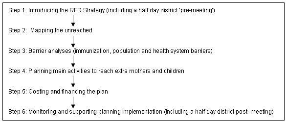 Internationally, RED is intended to address common obstacles to increasing immunization coverage; the obstacles include inadequate district planning, inadequate and unreliable services and monitoring and supervision of health workers. The five international RED operational components include the following: