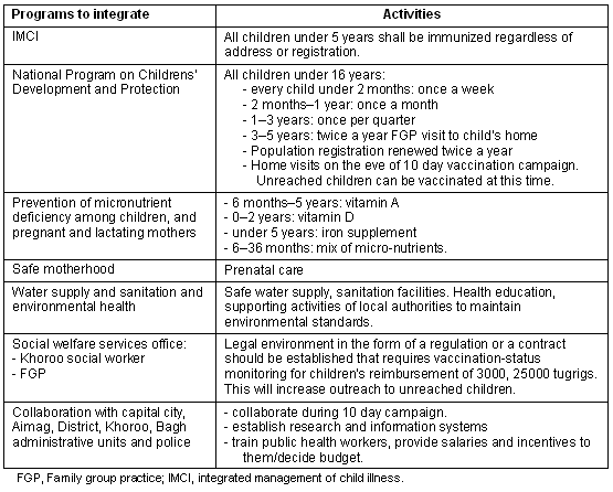 The development of this program was facilitated through the Regional Office of UNICEF, Bangkok Thailand (Ms Diana Chang Blanc) and the National Centre for Communicable Diseases, Ministry of Health, Mongolia, with technical support from the country offices of UNICEF and the World Health Organization. Funding was through the Global Alliance for Vaccines and Immunization.
