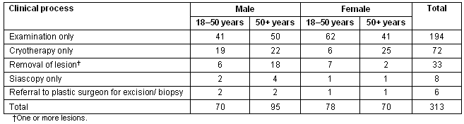 There was an average of 1.1 consultations per person (343 consultations in total), with a procedure performed in approximately one-third of consultations. Details of clinical processes are listed (Table 2). The demographic most likely to have a lesion removed were over 50 year-old males (p<0.0001).