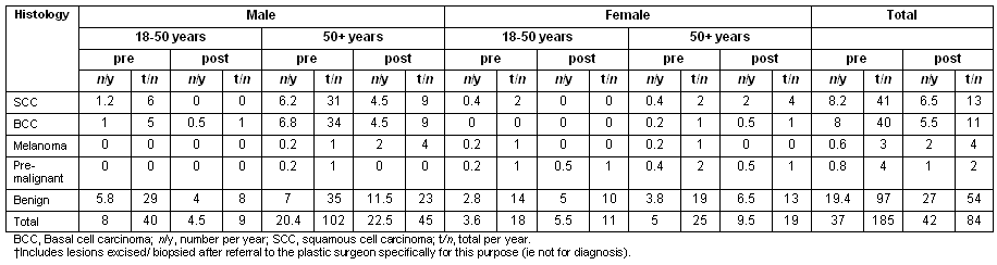 The histological findings by rate per year and absolute numbers of excised lesions are detailed (Table 3). This includes those lesions excised by the plastic surgeon after referral from the RFDS primary care skin clinic doctor who felt that the technical requirements of the excision were beyond the scope of the RFDS service. The rate of skin cancer detection was 15/1000 adults/year. The number of lesions removed/year increased from 37 to 42 after the intervention, with no statistically significant change in the percentage of excised lesions that were malignant (44%). The average age at removal of benign lesions was 52.1 +/- 16 years was statistically significantly younger than for malignant/pre-malignant lesions at 59.3 +/- 11.1 years (t = -4.333, p<0.0001). For over 50 year-old males, there was a statistically significant increase in the proportion of excised lesions that were melanomas (χ2 = 6.015; p = 0.013). This corresponded to a four-fold rise in melanoma detection from 0.2 /1000 people/year pre-intervention (a total of three in the 5 years before the clinic) to 2 /1000 people/year post-intervention (four in the 2 years of the skin cancer clinic's operation). There were no other statistically significant findings pre- and post-intervention across age and sex demographics.