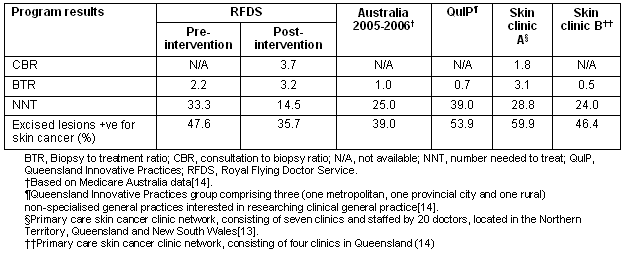 A comparison of the skin clinics' effectiveness compared with documented results from other Australian non-specialist skin cancer services is detailed (Table 4). There was a low number needed to treat for melanoma which is consistent with high diagnostic accuracy. This is also supported by a relatively high consultation to biopsy ratio. The biopsy treatment ratio and percentage of lesions that were malignant were similar to those seen in other Australian settings, suggesting that NMSC management was of a similar standard to those settings. In light of the trend for doctors working in metropolitan skin cancer clinics being required to have formal certification in skin cancer care, this is very reassuring. Although RFDS medical staff who work within the skin cancer clinic have a specific interest in this area, they are also clinically active in a variety of other clinical areas, including procedural areas such as aeromedical retrieval, and consequently have a considerable continuing medical education (CME) burden. Due to the difficulties experienced in sourcing all medical staff for remote Australia, the imposition of a formal requirement for specific training, certification and CME in skin cancer care would make it even more difficult to source medical staff for this clinic. A second benefit of the RFDS results being similar to metropolitan skin cancer clinics is that the patients who are the consumers of this clinical product can be reassured that their care is not being compromised by their geographical location.