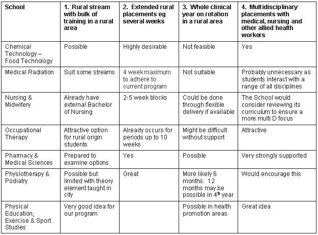 To increase the proportion of allied health and nursing students trained in rural areas, a series of four options (not exclusive) were presented to the Schools: