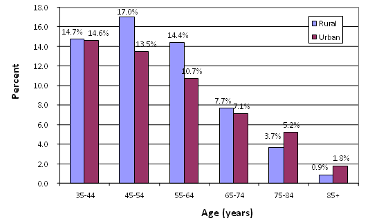 Keeffe and colleagues11 found that utilisation of eye care services increased with age. As with many diseases, age may have the greatest influence on visual impairment. It is therefore important to consider the age distribution of rural compared with urban populations.