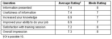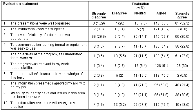 Between July 2002 and December 2006, 740 person-hours (359 attendees x 2.06 hours) of continuing education were delivered to resident care coordinators and social workers in nine sessions of VGRs. The intervention was evaluated using a questionnaire that consisted of 10 questions, measuring participant satisfaction level with a five-point Likert scale, and a comments section. Volunteer proctors distributed and collected attendance, basic demographic, and program evaluation forms at each site for each session and returned the data to Telehealth Idaho for analysis.