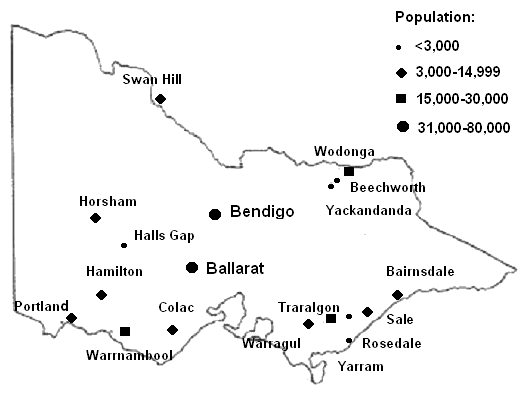 Figure 1: Map of Victoria, Australia, indicating towns where the Victorian Healthy Food Basket was collected.