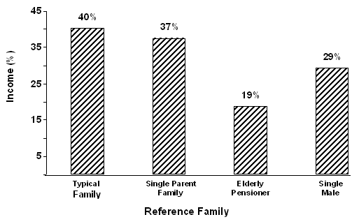 The median cost of the VHFB for a typical family did not differ significantly when purchased at a supermarket from chain A versus chain B (p = 0.41). If, however, the basket was purchased at an independent store, the cost was significantly higher (median cost $406.66 [$29.39] versus $394.93 [$26.64], for an independent store purchase and a supermarket purchase, respectively, p = 0.024). Figure 2 indicates the cost of a VHFB relative to income. Both an elderly pensioner (19%) and a single male (29%) would spend a significantly lower proportion of their welfare income on the purchase of a basket than would a four person typical family (40%; p<0.001 and p<0.05, respectively).