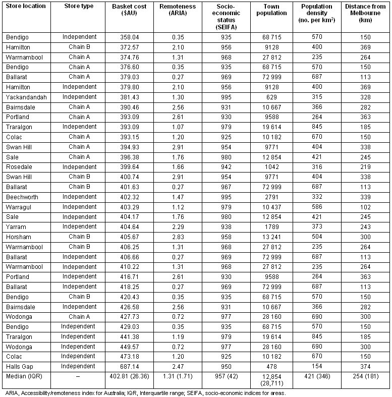 The median cost (IQR) of the VHFB for the typical family was $402.81 ($26.36). Basket cost varied by $329 from $687 per basket at the most expensive store (Hall's Gap, independent) to $358 at the least expensive store (Bendigo, independent) (Table 1). The cost of the VHFB was not significantly related to remoteness by ARIA (rho = -0.079), socioeconomic status by SEIFA (rho -0.005), distance from Melbourne (rho = -0.049) or population density (rho = 0.0164).