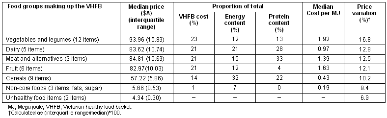 Table 2 indicates the median cost for different food components of the VHFB, with the cost of vegetables and legumes contributing the greatest proportion of the total cost of the basket, and unhealthy foods contributing the least. The cereal group was inexpensive but contributed one-third of the total energy content and 22% of the total protein content of the basket. The non-core food items were also inexpensive but contributed no protein and only 7% of total energy. Vegetables and legumes showed the greatest variation in price, significantly greater than price variation for cereals (p<0.05), non-core foods (p<0.05) and unhealthy foods (p<0.001).