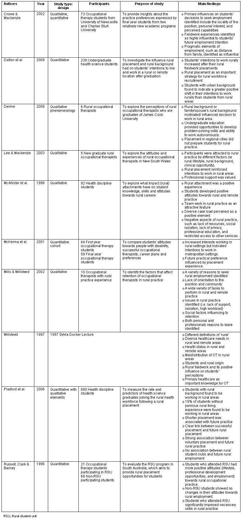 The 10 key articles identified are shown (Table 1). Dalton, Routely and Peek8 studied 239 undergraduate health science students, including occupational therapy students, who undertook a rural placement in Tasmania. It was found that a student's intentions to work rurally significantly increased after their rural fieldwork placement, with the exception of pharmacy students. The results of this study support the view that rural exposure during the undergraduate course positively influences a student's intention to work in a rural area. The authors stated that rural and remote clinical experiences during undergraduate studies lead to possible rural workforce recruitment8.