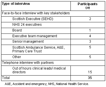 Stakeholders were defined as senior-level individuals working on the design and implementation of NHS 24. These stakeholders were purposively selected to include a range of views from various sectors, including the Scottish Executive (now the Scottish Government) Health Department (the policy sponsors for NHS 24), NHS 24 executives, health board management, the Scottish Ambulance Service, A&E consultants, and any other relevant individuals (eg located within secondary care, the Royal College of Nursing and Royal College of General Practitioners). These interviews were conducted between January and July 2005.