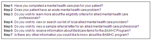 This first stage involved identifying and collating relevant information about BAMHC to inform the online 'decision support tool'. Consequently, the internet site contains a wide range of primary and supplementary information about the BAMHC program which allows GPs (and practice nurses) to quickly access key documents in one place, rather than having to search and download information from other sites. All the information on the website was gathered from reliable sources to ensure consistency in quality and relevance. Information sources included the following key organizations: the Commonwealth Department of Health and Ageing; Australian General Practice Network; Australian Division of General Practice and other general practice divisions; and the Australian Psychological Society.