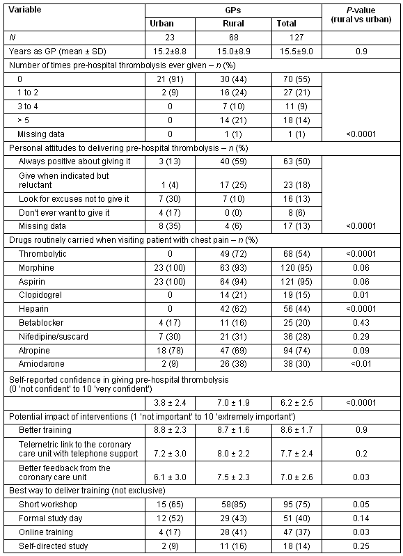 General practitioners' attitudes to pre-hospital thrombolysis are thought to be crucial in the delivery of this service4; however, even in the area where the GREAT study was undertaken, the uptake of pre-hospital thrombolysis greatly fell after the study was completed5. Differences in perceptions between rural or remote and urban GPs have not previously been examined.