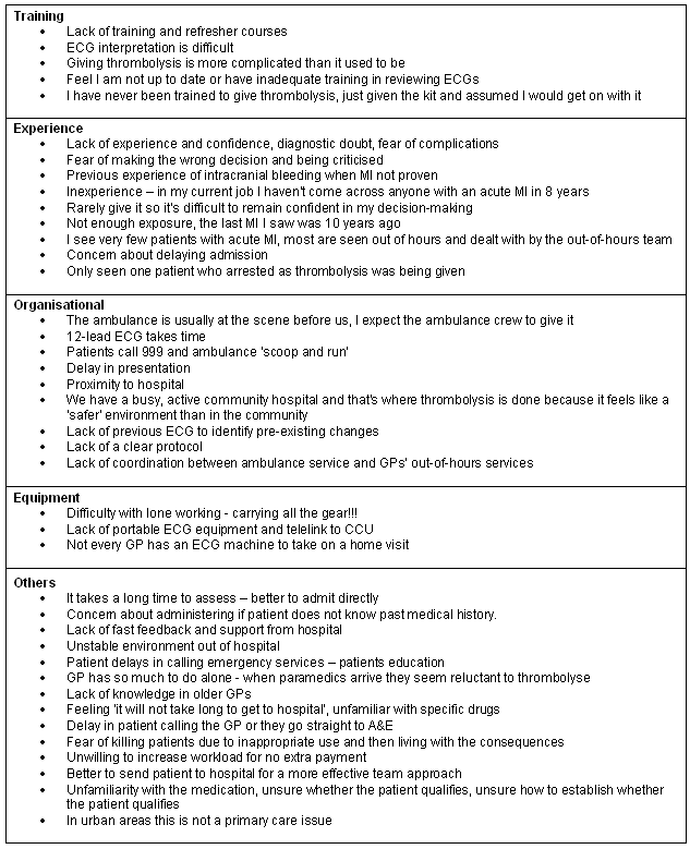 Training: A major and recurring theme with GPs was the perception that there is poor training in the delivery of thrombolysis: 'lack of skills in ECG interpretation', 'I have never been trained to give thrombolysis - just given the kit and assumed I would get on with it', 'I feel I am not up to date'.