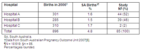 The number of births conducted at the 3 hospitals in 2006 are given, as are the numbers and percentages of participants enrolled at each hospital (Table 1). The births at the 3 hospitals are also presented as percentages of the total births in South Australia (Table 1).