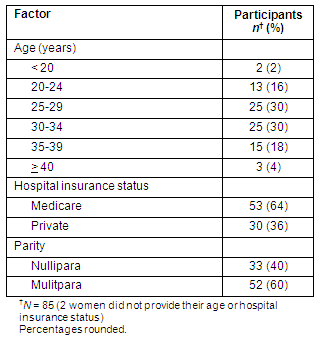 Table 2 presents the age ranges, health insurance and parity of the women in the study. For 33 women (40%) this was their first baby. The age mode was shared by women aged between 25 and 29 years (15%) and 30-34 years (15%). Thirty women (36%) had private health insurance, usually with a GP/obstetrician.