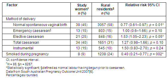 Among the 18 519 births to women in South Australia in 2006, 5257 (28.4%) lived in a rural area2. Rates of spontaneous vaginal birth for the study sample were lower than that of the combined rural residents, 38% versus 58% (RR 0.77 [0.61-0.97], p = 0.01; Table 3). Although there was a definite trend, no significant difference was found in the total caesarean section rate between the study group (40%) and rural residents (31%; RR 1.27 [0.98-1.66], p = 0.10; Table 3). Neither was there any difference in comparison with South Australian births overall (33%; RR 1.36 [0.88-2.09], p = 0.2)2. 'Elective' is the term used to describe a planned caesarean section delivery, while 'emergency' describes a planned vaginal birth that results in a caesarean. Study participants had a significantly higher rate of elective caesarean section (25%) when compared with rural residents (16%; [RR 1.53, 1.05-2.23], p = 0.05; Table 3). Fewer study women smoked throughout pregnancy (8 of 85 [9%] vs 1238 of 5237 [24%] of rural residents [RR 0.40, 0.21-0.77], p = 0.002; Table 3).
