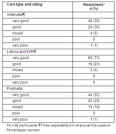 Women were invited to rate their overall antenatal; labour and birth; and postnatal care as 'very good', 'good', 'mixed', 'poor' or 'very poor'. A rating of 'very good' indicates a high level of satisfaction3. Fifty-nine percent of women rated their care as 'very good' during the antenatal period; 73% during labour and birth; and (52%) postnatally, followed by 'good' at 35%, 23% and 29%, respectively (Table 4). The response 'mixed' which indicates low satisfaction3 was more prevalent for postnatal care (18%) than for labour and birth (4%), or antenatal care (5%). Of the women whose response to their postnatal care question was 'mixed', 12 of 15 (80%) provided further comments with specific concerns. These are summarised as: being left to 'fend for themselves' (n = 7), having negative experiences with a staff member (n = 4), and being given conflicting advice (n = 2). When asked how they viewed their maternity care overall, most women (60 of 85; 71%) responded positively. A further 55 of 85 (65%) indicated that there were no aspects of their care with which they were unhappy. For example one woman stated 'midwives were always available, always encouraging and were also kind', while another felt that a positive aspect was being 'monitored the whole time'. Some women provided comments about specific issues with which they were unhappy. One women was unhappy with 'not being given a clear picture as to why my labour was not progressing to possibly avoid a "caesar"', and another who had a caesarean delivery commented about the 'number of people in the theatre that I didn't know or think really needed to be there'. Responses from the 30 women who were privately insured when compared with the 55 women with Medicare-only (the Australian government-funded national healthcare system) cover revealed no differences in any of the ratings of care.