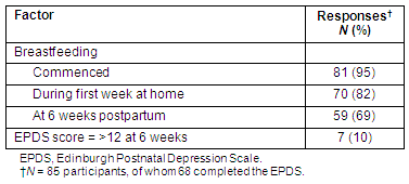Breastfeeding was commenced by 81 of the 85 women (95%; Table 5). Women were asked whether they were breastfeeding in their first week at home and again at 6 weeks after the birth. Seventy of the total sample (82%) were breastfeeding during their first week at home, and 59 of the sample (69%) were still breastfeeding at 6 weeks (Table 5). When rates of breastfeeding for hospital and privately insured women were compared there were no differences identified at any assessment points.