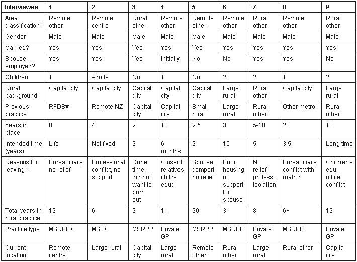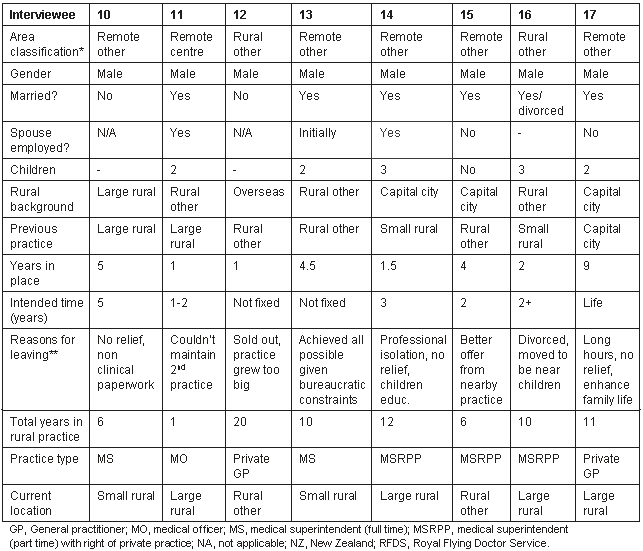 The data used here were originally collected for an in-depth survey of practitioners' reasons for leaving rural practice. While in-depth, the interviews were reasonably open (ie semi-structured) in terms of the topics covered.