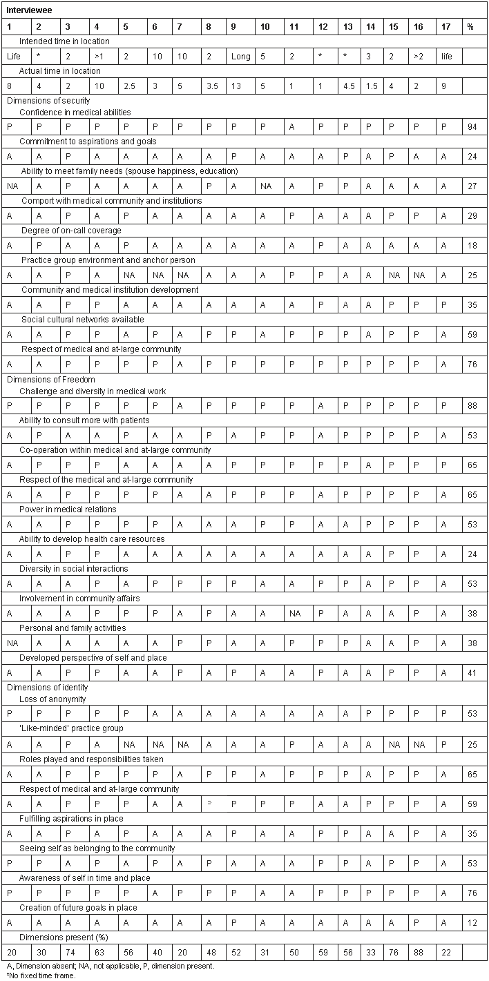 In reviewing the individual transcripts, we assessed whether each dimension was raised either positively (present) or negatively (absent) and, in the event that no mention of a dimension was made, it was also coded as absent. Not all dimensions were applicable to all interviewed practitioners (eg 'family' for an unmarried practitioner; and 'group' for a solo practitioner). Comparisons were made between each practitioner's early expectations and their later experiences in order to determine the strength and direction of the evidence for each dimension and in an attempt to nullify purely negative responses relating to the time of departure.