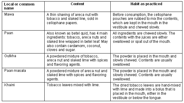 Areca nut is present in a number of chewing products, for example, paan (betel quid), gutka and paan masala (Table 1). These products contain lime, area nut and tobacco. Betel quid consists of a mixture of areca nut (with or without tobacco), slaked lime, catechu and several condiments according to taste, wrapped in betel leaf. While areca nut chewing may cause oral submucous fibrosis, its use along with tobacco can cause leukoplakia, which is also a premalignant lesion. Use of other condiments and ingredients in betel quid can cause lichenoid lesions8, the premalignant potential of which is not known.