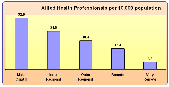 It is well known that there is a national shortage of allied health professionals and that this problem is worse in rural areas14. An analysis of 2001 ABS census data undertaken by Services for Australian Rural and Remote Allied Health (SARRAH) in 2004 demonstrated that people living in outer regional centres have access to only about half as many allied health professionals as people living in metropolitan centres. This figure decreases to less than a quarter in some remote locations(Fig1). The per capita reduction of allied health services associated with increasing rurality has implications for the healthcare needs of rural and regional residents. In particular, the ageing population could stretch the already sparse allied health workforce beyond the ability to cope with the expected increased demand for services.