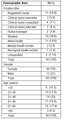 Table 1 outlines respondents' position titles, gender and ages. The majority were nurses or pre-registration nursing students (67.9%, n = 38), of which 79% (n = 44) were female. The most frequent age range was 31-40 years (n = 14, 25%).