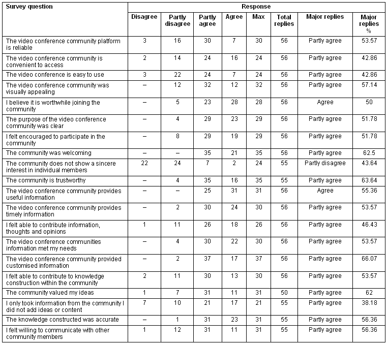 All 56 respondents agreed or partly agreed that the videoconference community provided useful information. The majority of respondents (n = 54, 96.4%) agreed or partly agreed that the videoconference community provided both timely and customised information. A large number of respondents (n = 52, 92.9%) agreed or partly agreed that their needs were met and that they felt able to contribute information thoughts and opinions (n = 44, 78.6%).