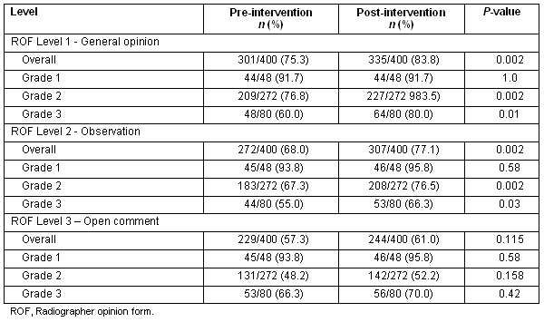The results are shown in Table 1. Overall, for the combined total of 400 cases, the radiographers' level of accuracy did not reach the 85% target, either before or after the CE intervention. At the 'general opinion' and 'observations' levels there was, however, a statistically significant improvement in the radiographers' accuracy between the pre- and post-intervention testing. At the 'open comment' level there was a slight increase the proportion of cases interpreted correctly for all grades of complexity, although the improvement was not statistically significant.