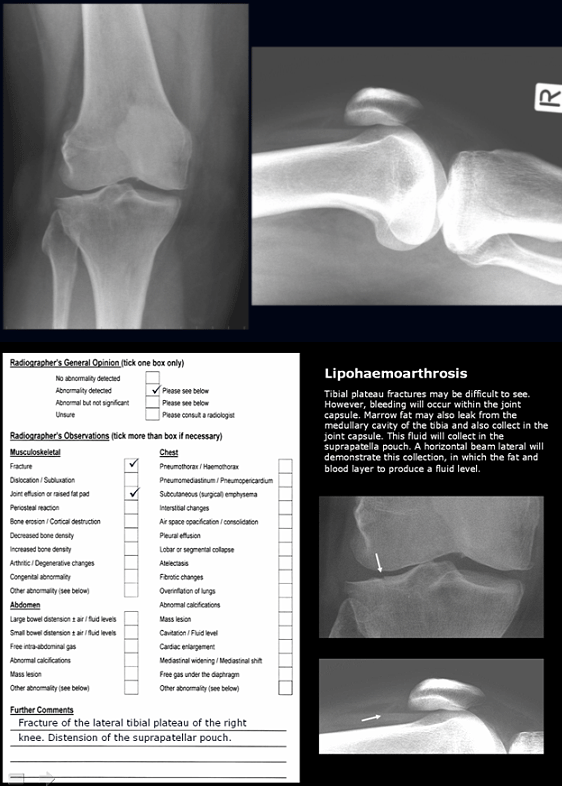 Figure 1: An example of the Microsoft PowerPoint directed learning, self-test image interpretation quizzes (top) with model answers using the radiographer opinion form (ROF) format.