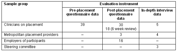 A mixed method approach was used in the collection and analysis of evaluative data (Table 1)10. Briefly, quantitative and qualitative questionnaire responses from clinician participants, their employers, and providers of the education at metropolitan hospital sites, were supplemented with qualitative interview data from these sample groups (and the program's steering committee). The analysis used interpretative methods to examine the key strengths, limitations and potential for future development of the program. An important component of the evaluation design was the accommodation of multiple perspectives from the varying groups involved in the program. While the views of people with cancer and their families were beyond the scope of this evaluation, the program's impacts on services and support for people with cancer are explored through qualitative data from participants and their employers.