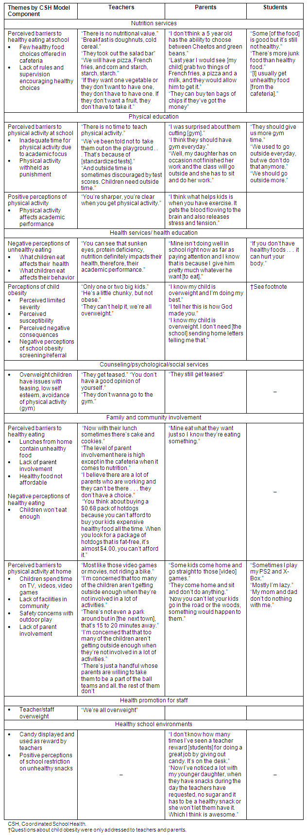 Moderators used a written guide (available from the authors) developed specifically for the study and participant group, bearing in mind the CSH model, with input from the coalition to facilitate the discussion and provide consistency across the groups. Open-ended questions and queries were used to facilitate discussion. All groups were asked similar questions regarding perceptions of school nutrition (eg 'What do you think about the food served in the school cafeteria?') and physical education (eg 'How much physical activity and physical education do students get at school?'). Questions also assessed family and community involvement with children's eating and physical activity as well as views regarding the relationships among eating and physical activity, school behavior and academic performance. In addition, teachers and parents were asked about perceptions of child overweight and perceived barriers/reactions to a school-based obesity prevention program based on the CSH model. Students were asked about school rules and changes the school should make regarding nutrition and activity. Nothing was asked about 'weight' or discussed during the student focus groups.