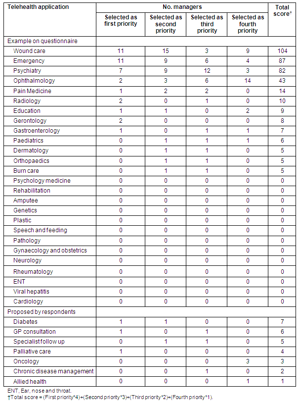 Any respondent could propose up to four priorities for telehealth. These were selected from the 26 examples listed in the questionnaire, or an unlisted telehealth application could be suggested. To calculate the collective priorities of the managers and the doctors, a simple scoring method was used. A value of 4 was assigned to the top priority of each respondent; 3 was assigned to the second priority, 2 to the third priority and 1 to the fourth choice. The scores were added to calculate the total for each telehealth application.