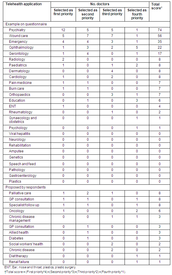 Table 2: Doctors' priorities for telehealth (combined scores from four priorities)