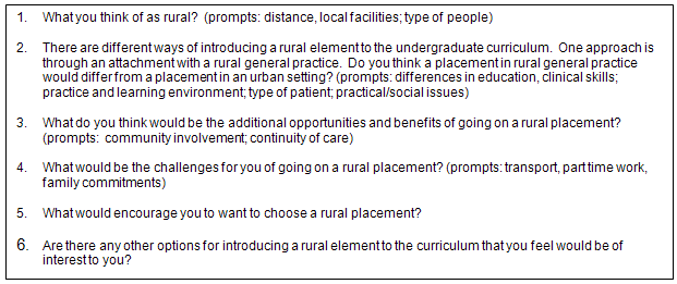 The focus group meetings were of approximately 45 min duration and were conducted within the medical school by two of the authors (JD and JRS), both of whom were independent of the university and had no other contact or relationship with medical students. Key issues explored included student perceptions of the meaning of 'rural' and the learning opportunities offered by rural clinical placements, following an agreed set of questions based on the literature and perception of local teaching faculty (Fig1). Authors JD and JRS jointly thematically analysed the audio-recorded and transcribed conversations, reaching agreement on and validating the emerging themes.