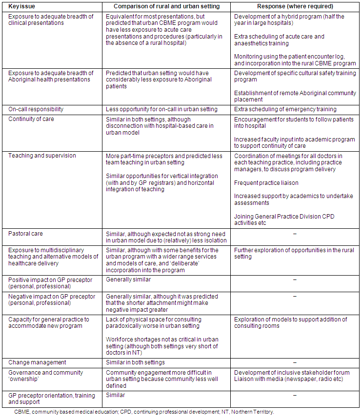 In translating a successful rural CBME model to an urban setting, we predicted that a majority of the reported educational advantages would persist (Table 1). From analysis of the international literature, local BEACH data and consultation findings, we were confident that the new urban program would offer students equivalent high quality learning experiences. These include exposure to core clinical presentations, continuity of care23, integrated learning23, one-to-one supervision and mentoring, and pastoral care24. In addition we expected the urban program to offer exposure to a range of models of healthcare delivery, for example private general practice, Aboriginal community control and public health clinics.