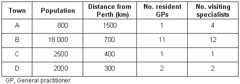 Town A is an isolated mining town, with an impressive number of visiting services. Town B on the state's southern coast has the largest population and number of resident medical services. The agricultural towns C and D are reliant on visiting services for anything other than basic care.