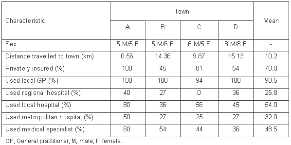 Eight focus group discussions15 were held in four regional WA towns between May and June 2000. Towns had a combination of resident and visiting medical services related to population and proximity to the metropolitan area (Table 1).